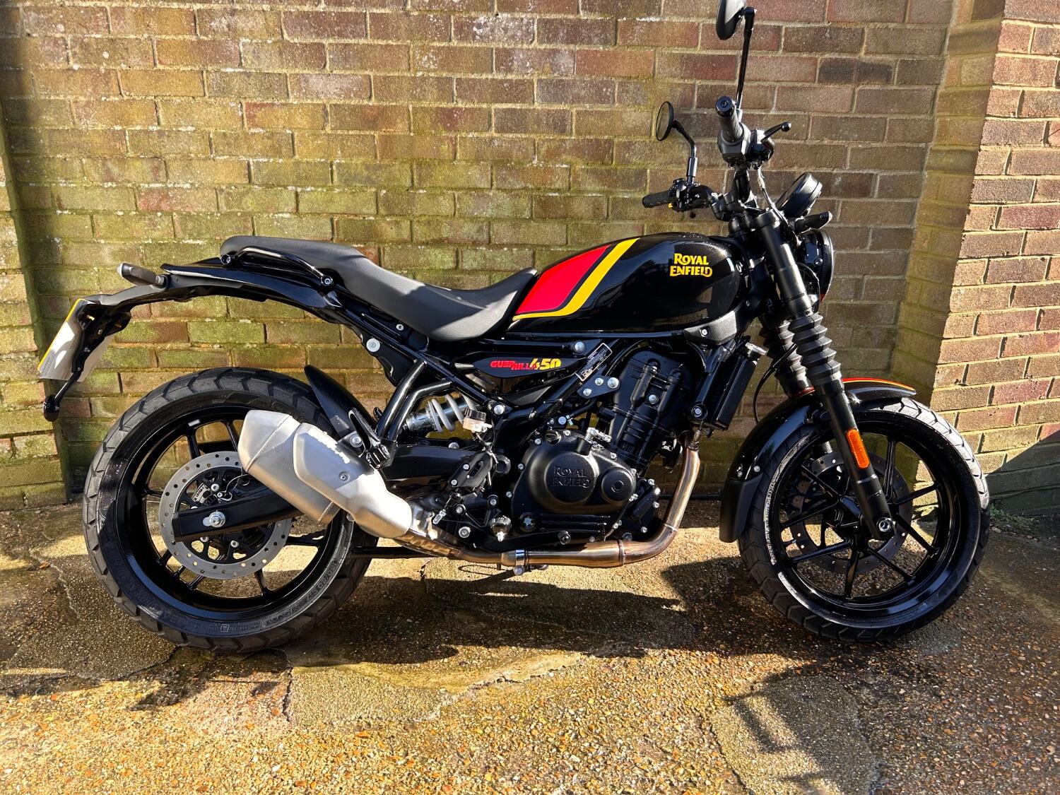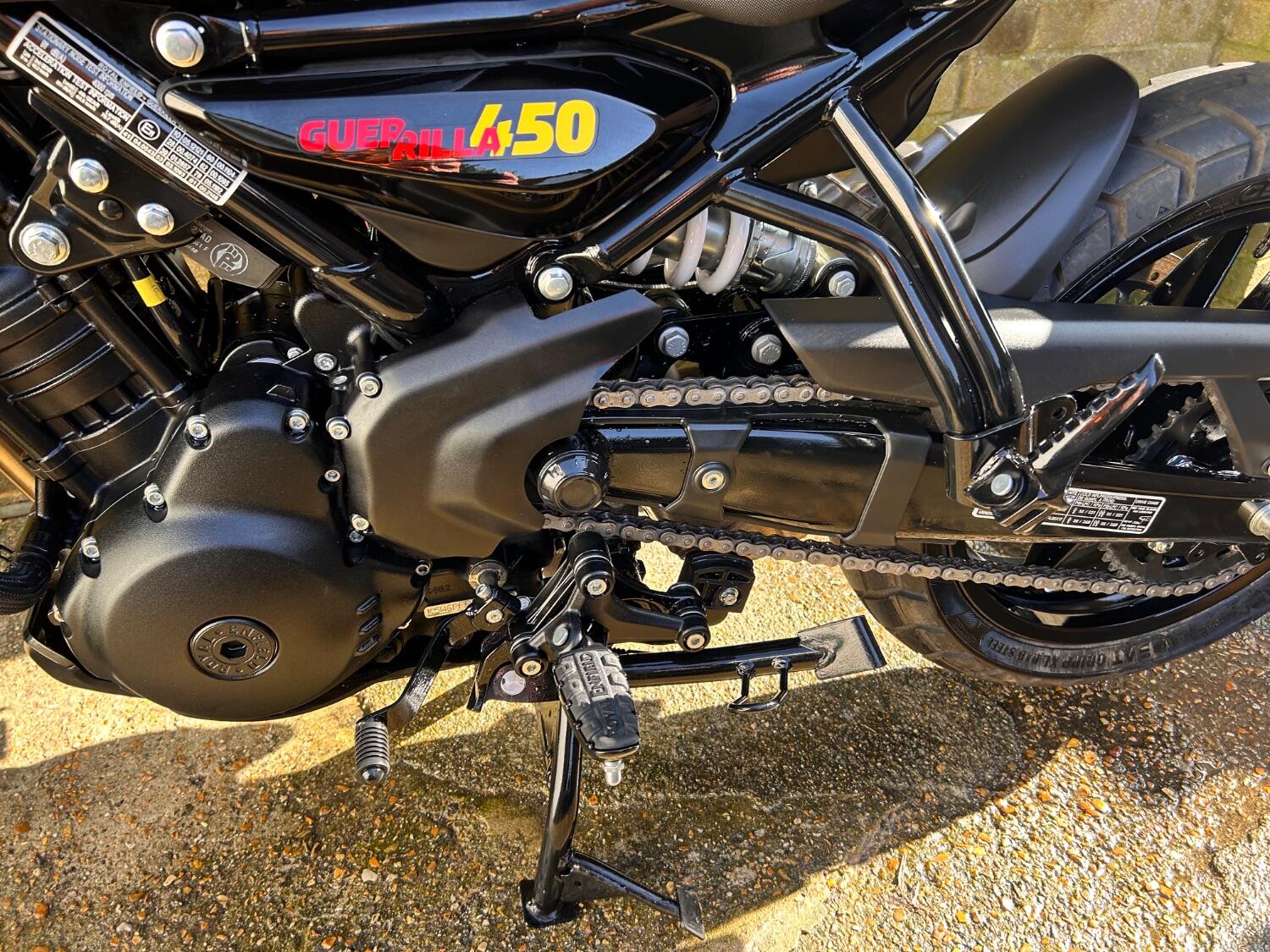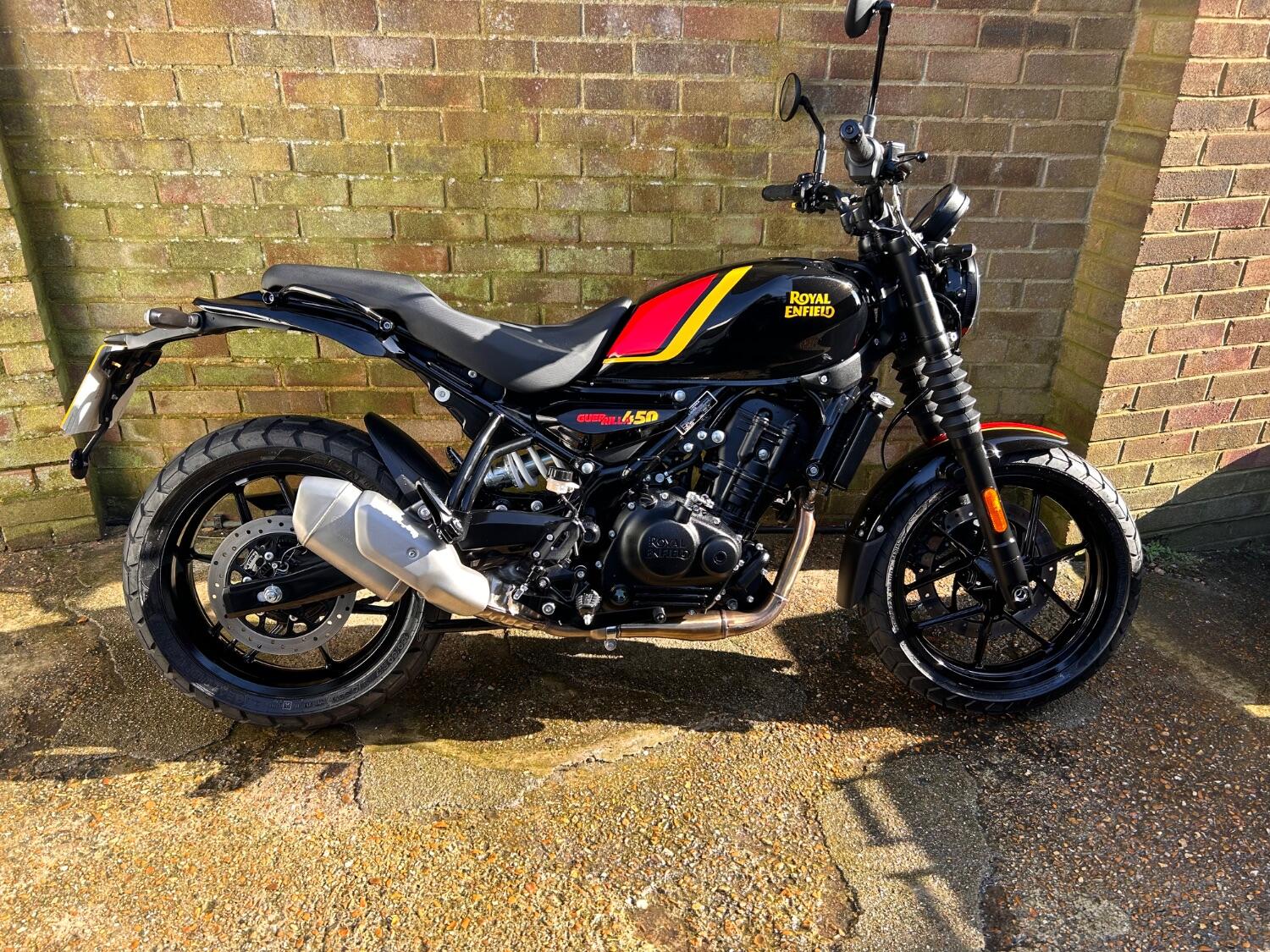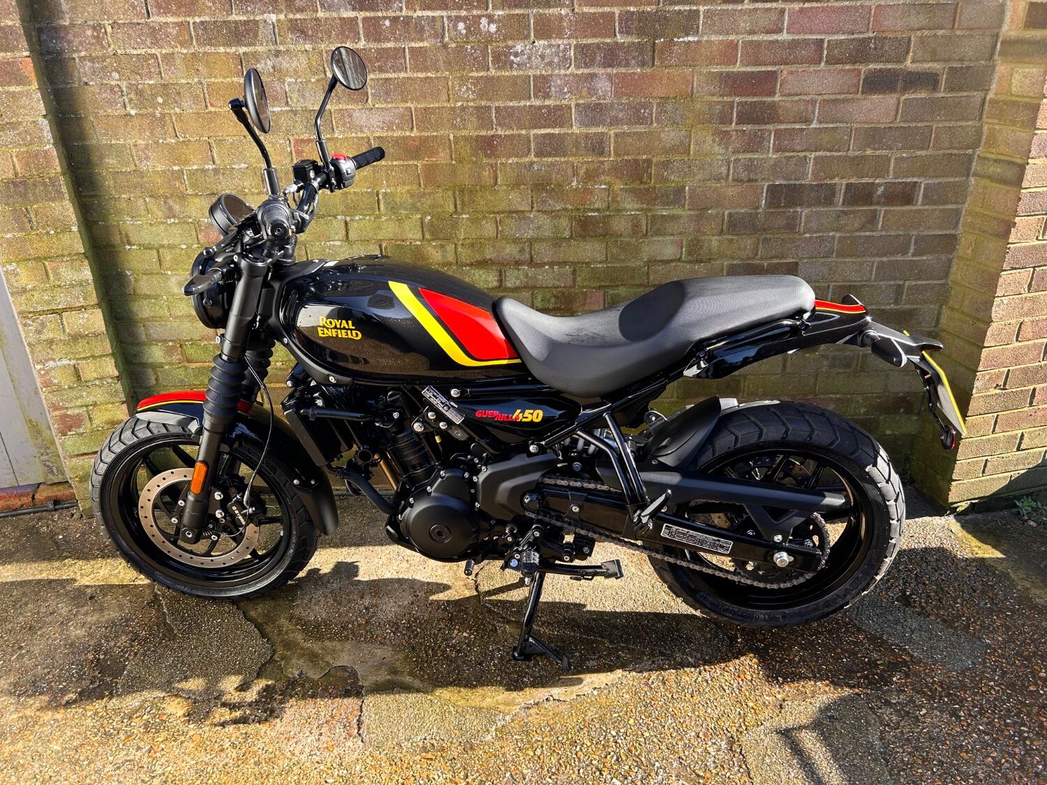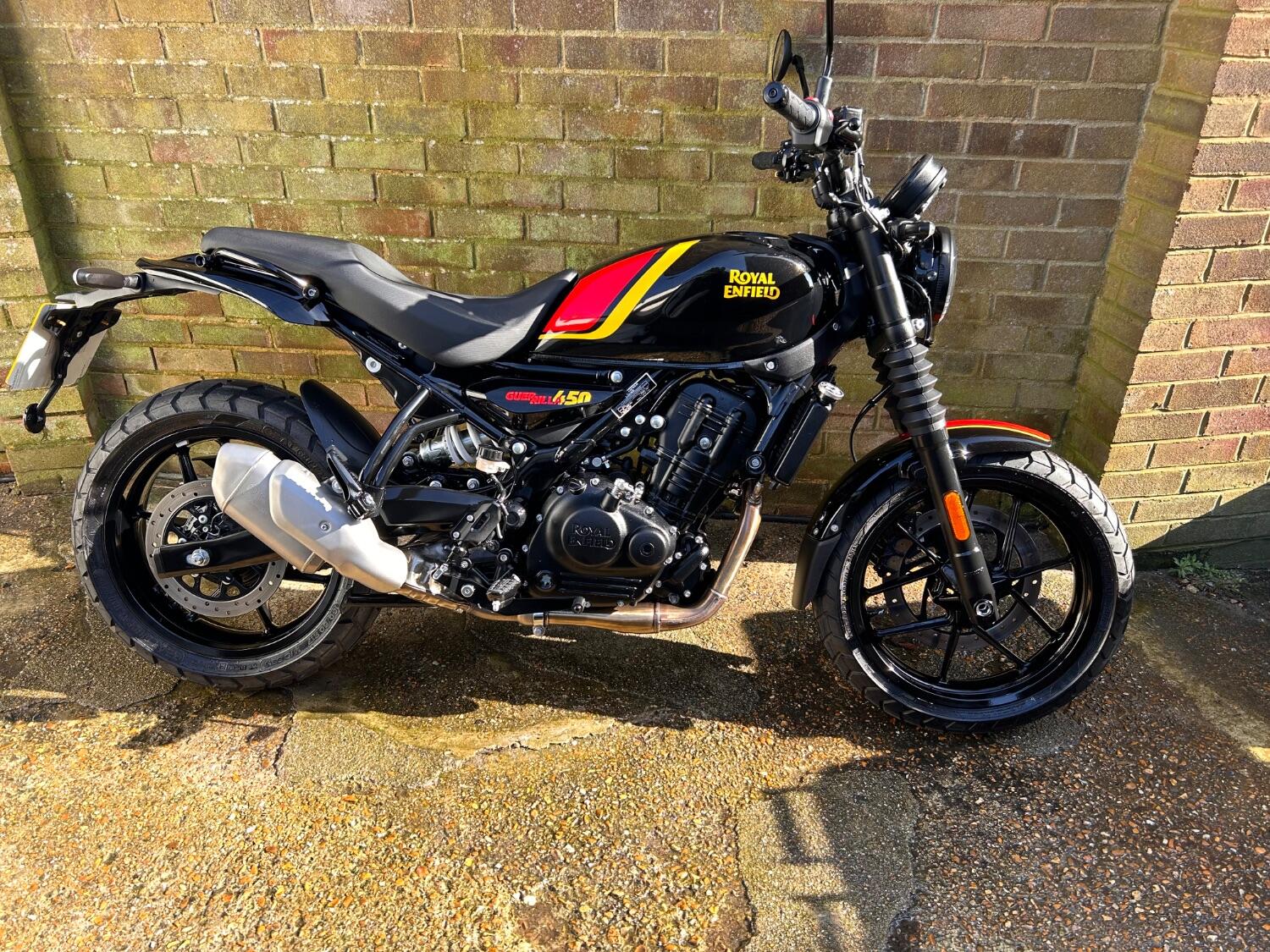 Here we have this stunning Royal Enfield Guerrilla 450, fitted with a USB-C charging port, Front fender extender, This bike has 2 keys, full service history, and only 300 miles. The bike has had one owner from new, The bike will come with the Balance of the manufacture warranty, with the option to extend to 12-24 months. We offer nationwide delivery on all of our bikes. HPI checked, comprehensive safety check, MOT history check, and professional valet included. Reserve this bike on our website now
