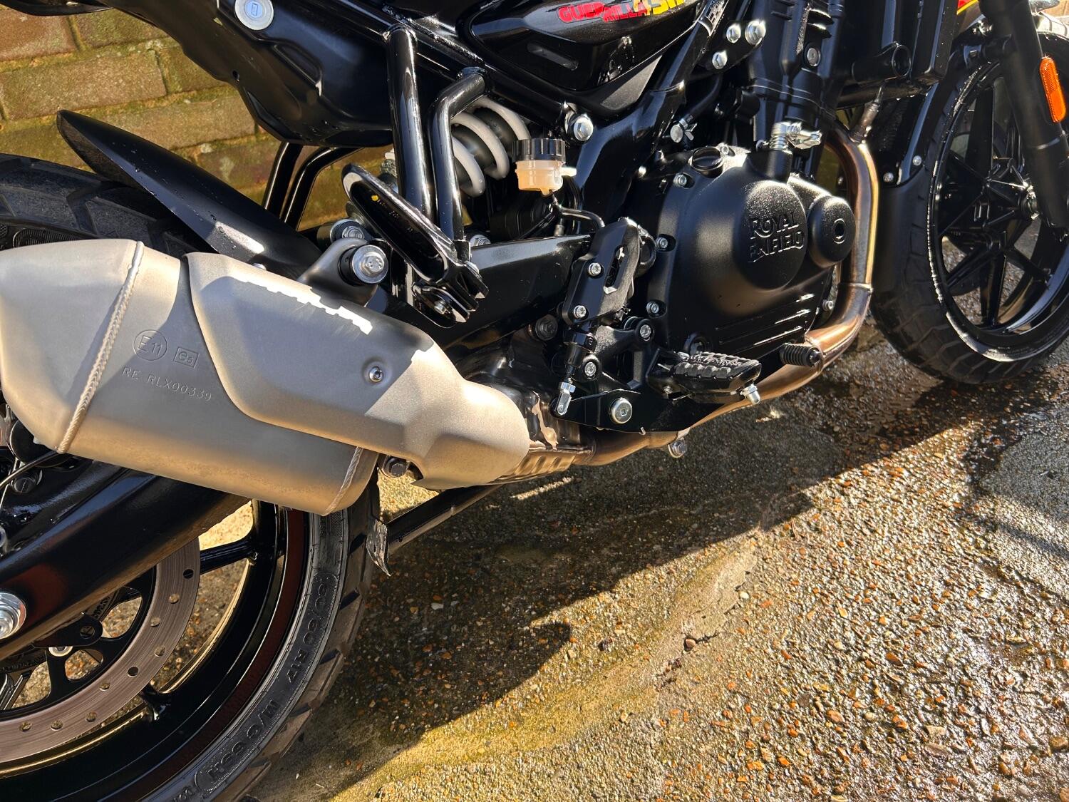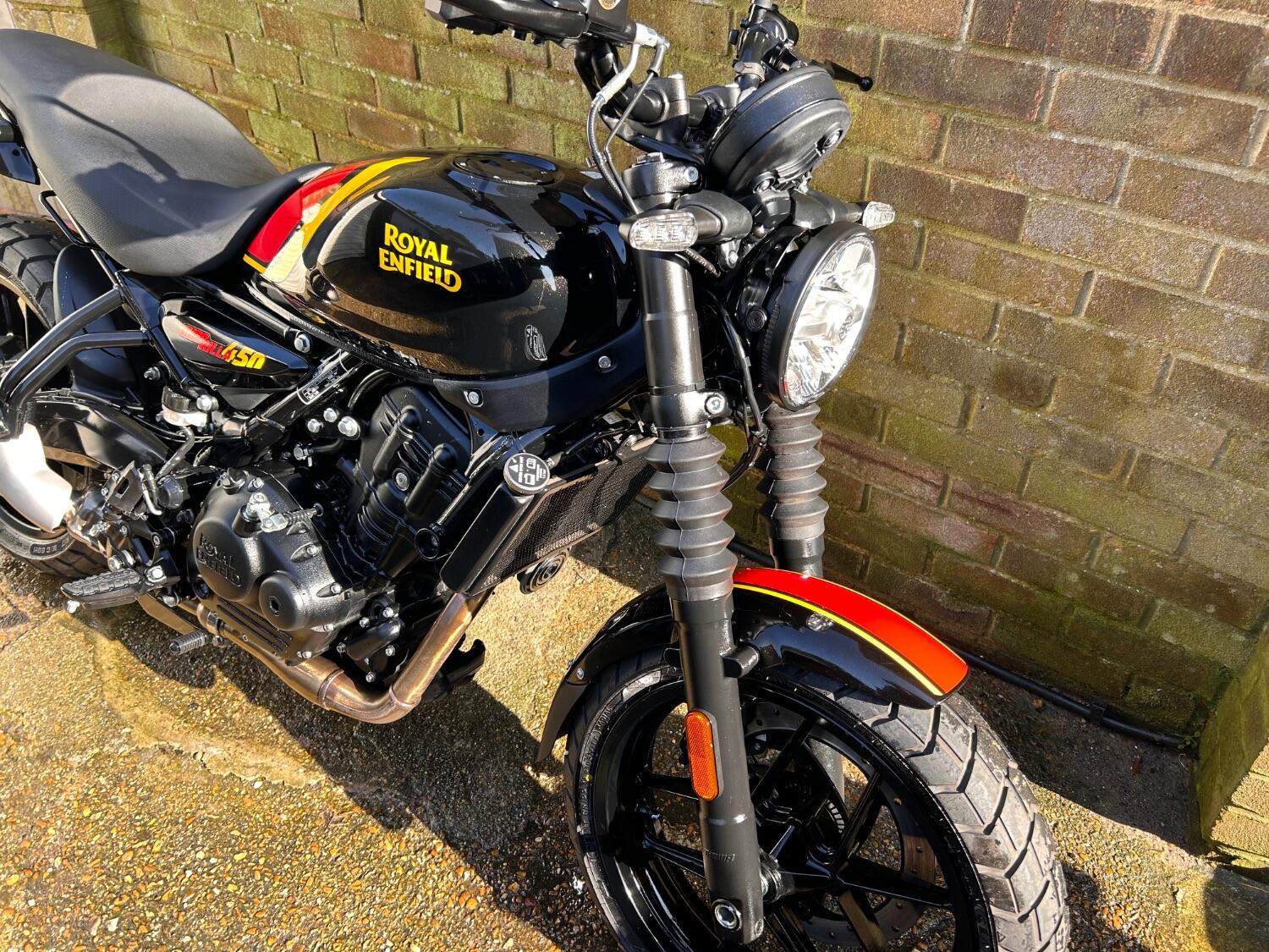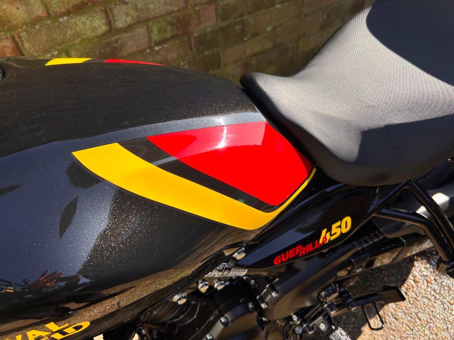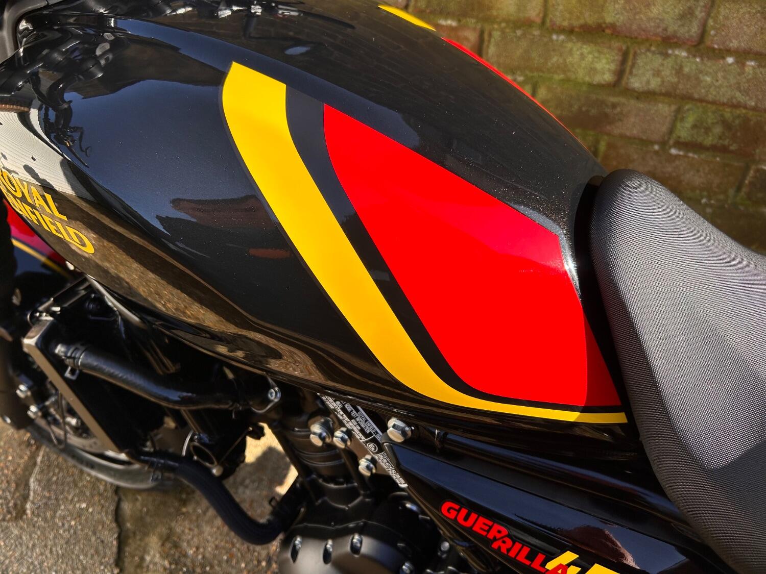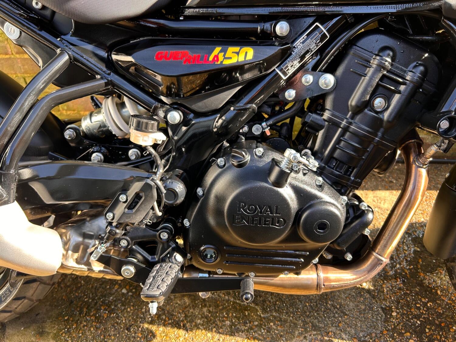 Here we have this stunning Royal Enfield Guerrilla 450, fitted with a USB-C charging port, Front fender extender, This bike has 2 keys, full service history, and only 300 miles. The bike has had one owner from new, The bike will come with the Balance of the manufacture warranty, with the option to extend to 12-24 months. We offer nationwide delivery on all of our bikes. HPI checked, comprehensive safety check, MOT history check, and professional valet included. Reserve this bike on our website now