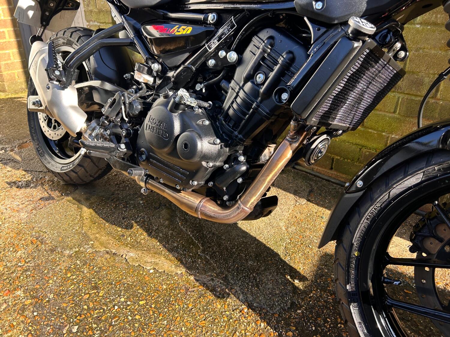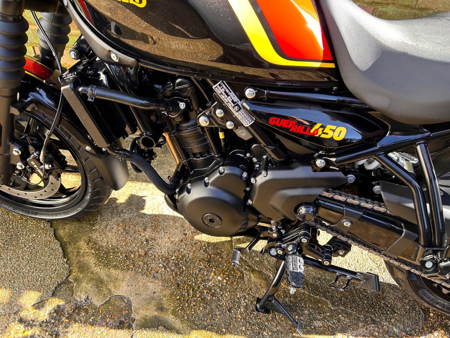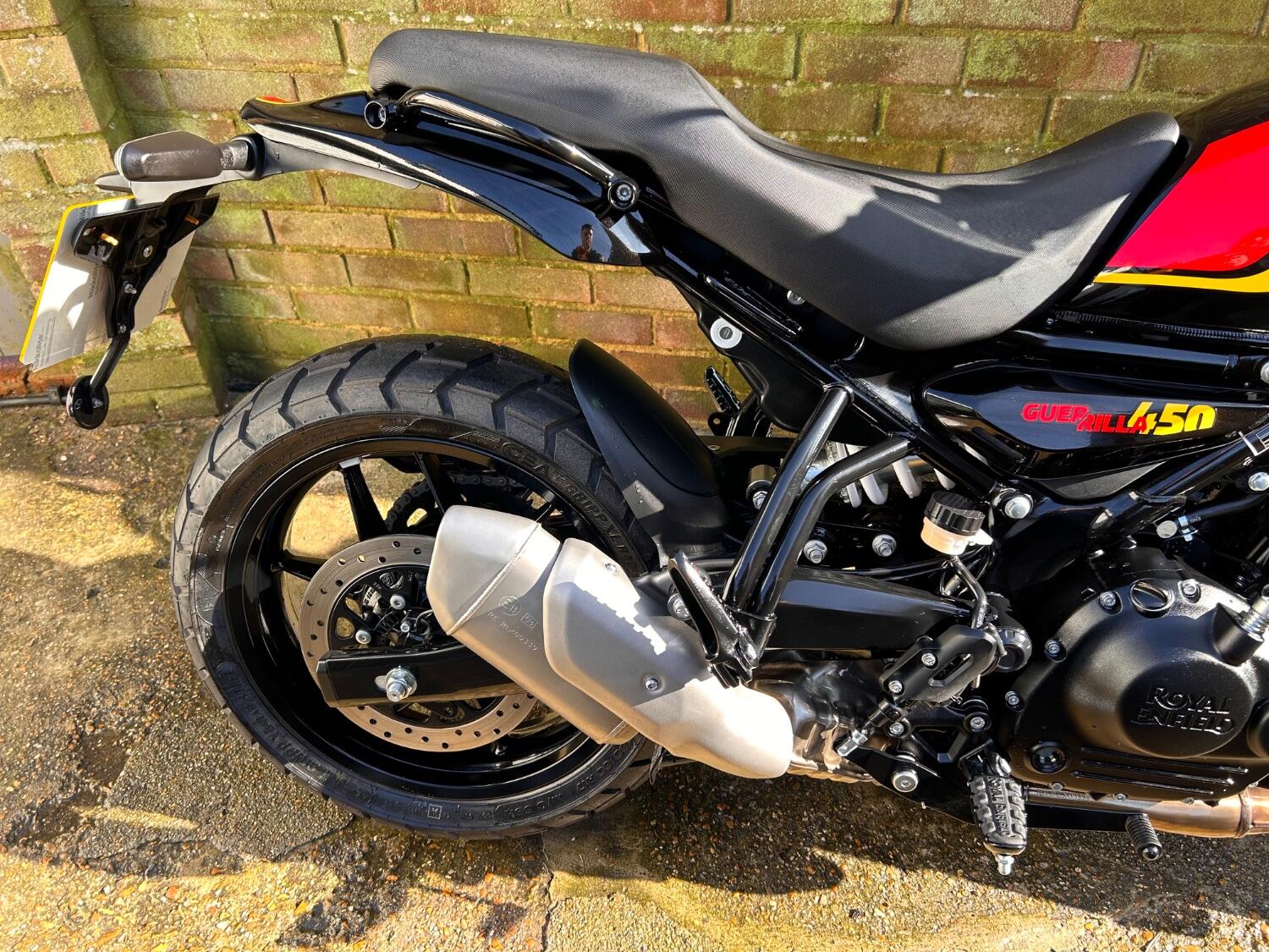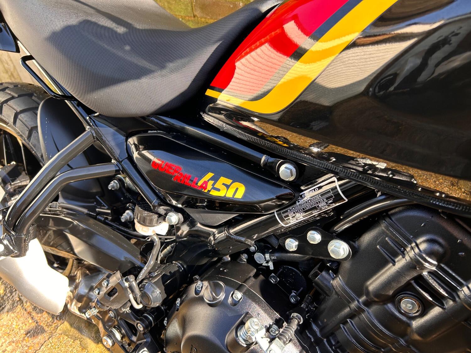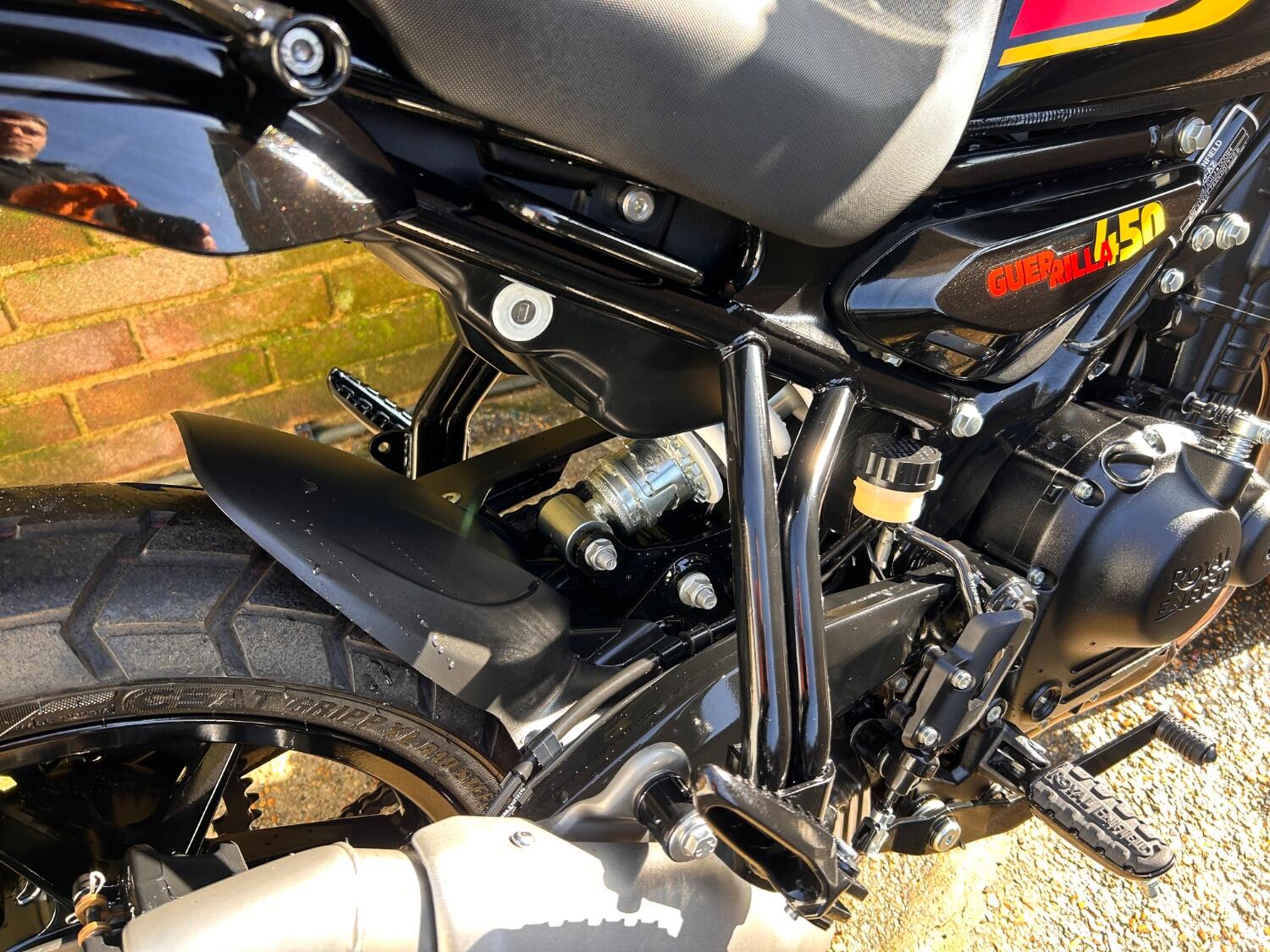 Here we have this stunning Royal Enfield Guerrilla 450, fitted with a USB-C charging port, Front fender extender, This bike has 2 keys, full service history, and only 300 miles. The bike has had one owner from new, The bike will come with the Balance of the manufacture warranty, with the option to extend to 12-24 months. We offer nationwide delivery on all of our bikes. HPI checked, comprehensive safety check, MOT history check, and professional valet included. Reserve this bike on our website now